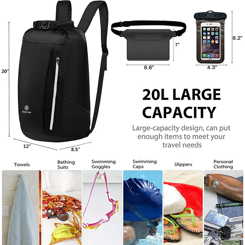 3. Lightweight and practical: With a large capacity of 20L but weighing only 0.45 pounds, it can be easily folded into your own pocket for storage. The marine dry bags capacity is large enough to fit clothes, shoes, mobile phones, cameras and other items, and is suitable for waterproof travel bag.