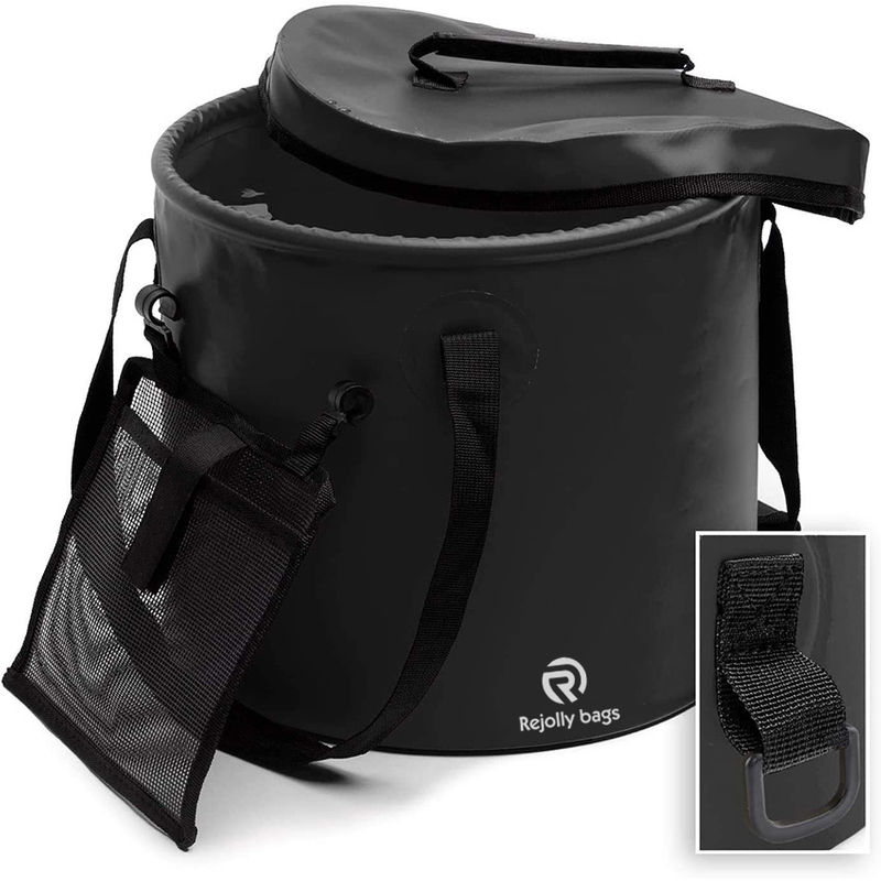 -REMOVABLE MESH POCKET AND LID INCLUDED: Use the removable mesh bag for your fishing equipment, gardening tools, cutleries or anything you need to bring together with your foldable bucket. A lid and durable handles are also included for easier pouring.