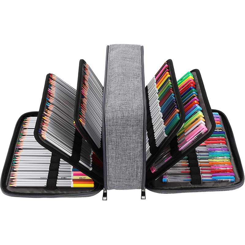 1. 5 layers with 100 large elastic loops. A great case to hold up to 300 colored pencils or 200 gel pens. Your pencils, pens are no longer scattered everywhere. You will be enjoyed that the compartments fold out, makes it visually pleasing to the eye when choosing your colors. And the pocket outside can keep small notes, cards, erasers, brush markers or any other stationery.