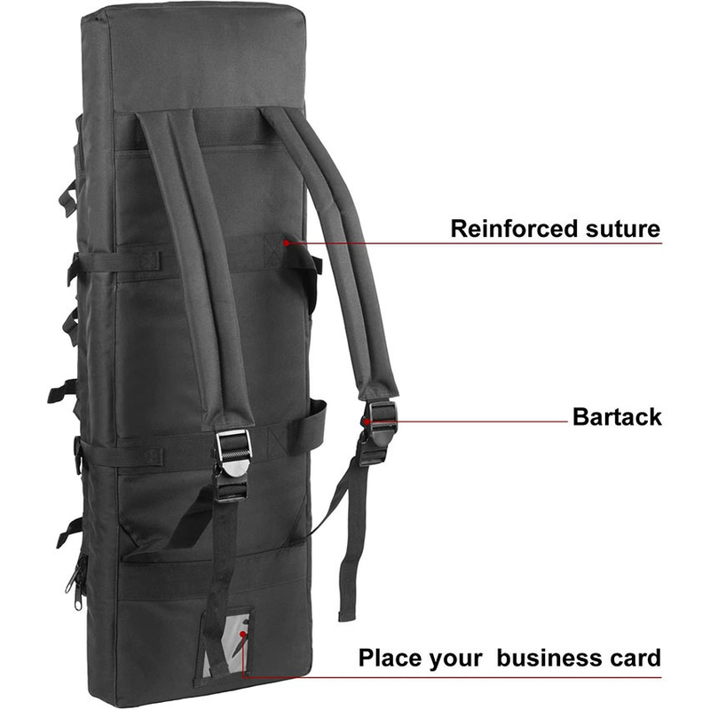 1. MESSENGER BAG DIMENSIONS: 109 x 10 x 35 cm;This Double Rifle Bag is amazing! Constructed of high quality water/dust resistant material, the double rifle case features a dual-rifle main compartment with integrated padded dividers and hook & loop straps to secure your rifle.