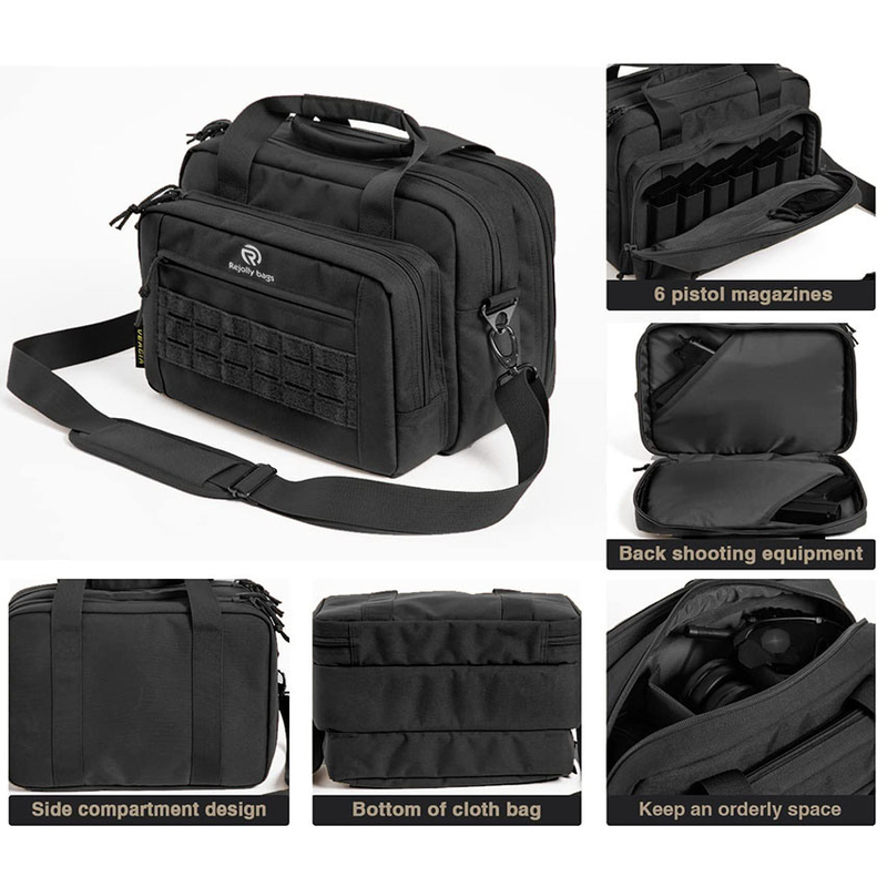 4. MULTIPLE ORGANIZER POCKETS:The gun bag for range,The main compartment is reinforced with a 2mm thick PE floor,laser cutting Molle can paste the flag logo, expand the external small bag, stitched with double nylon thread, reinforced, portable and firm shoulder strap. Pistol Soft Carrying Bag, double range pistol gun box.