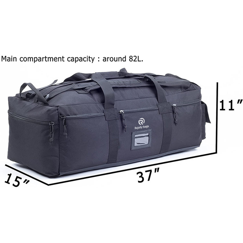 2.CAPACITY:A huge deployment bag for your kinds of need. One top load main compartment with zipper closure and 6 external pockets and sleeves for quick and easy access. Main compartment is around 84L. 6 external pockets and sleeves is about 6L.