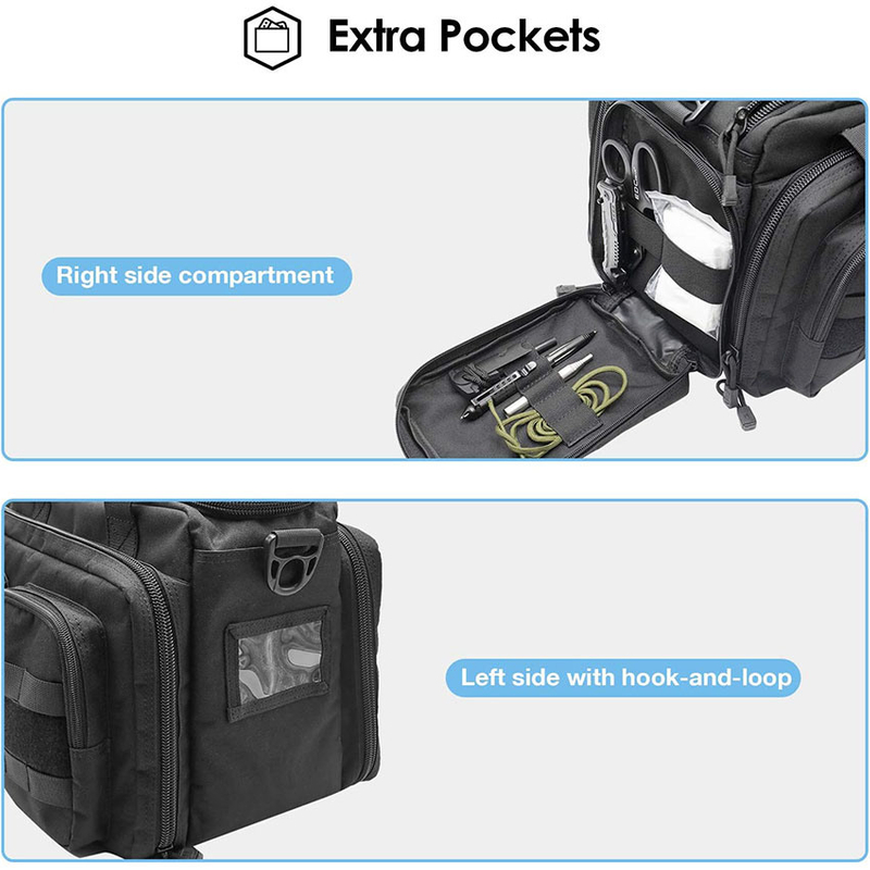 4. MULTIPLE ORGANIZER POCKETS: Main compartment with adjustable divider built-in 2 large pockets accommodates up to ear muffs and range accessories; Total 12 elastic loops in middle and back compartment hold the magazines securely.