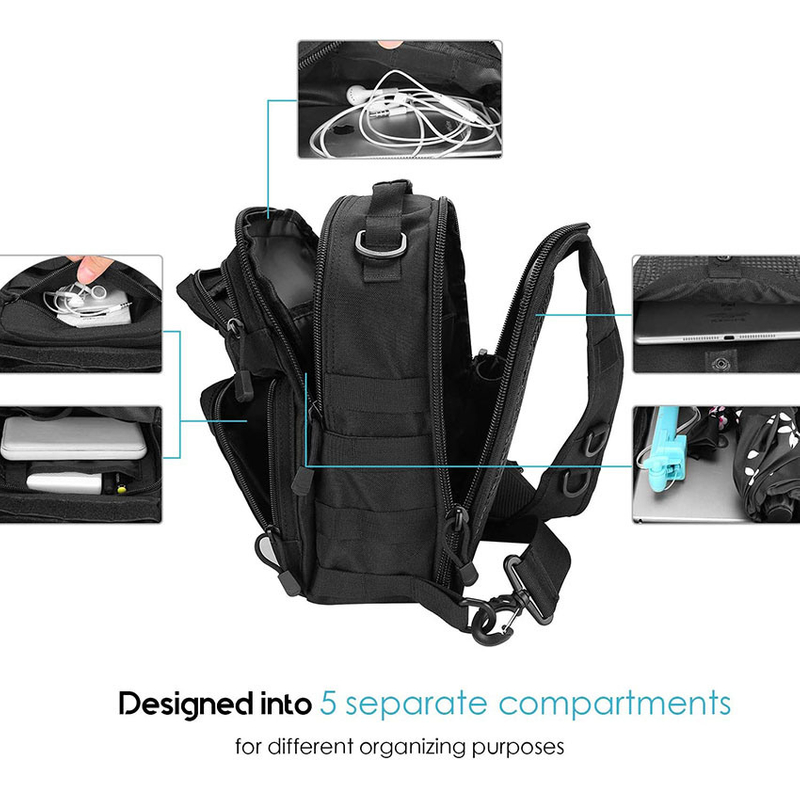 4. Detachable and adjustable shoulder strap for convenient carrying; Versatile 3 ways carrying style: shoulder bag, chest sling-back sling, or simply hand carry it in hands; Also has two smaller straps to help reduce the sway of the bag while moving as small military rover shoulder sling backpack.