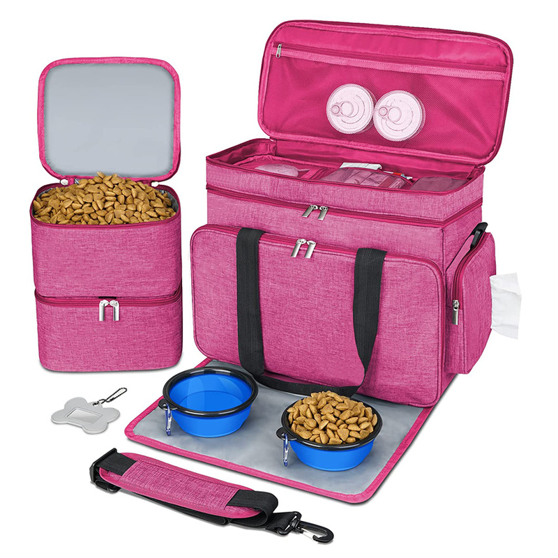 -The travel dog bag has 1 placemat, 2 dog food travel container for dog food and treats which can keep your pets fed and hydrated all the time. There are 2 colors of the dog accessory organizer to choose from which can mix and match with your outfit. The travel bag for dogs has 4 luggage sleeve for keeping the bag on the luggage and easy travel.