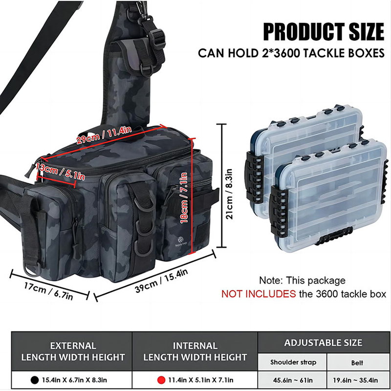 -COMFORTABLE AND BREATHABLE SLING BAG: The fishing tackle bag come with padded shoulder strap can perfectly suits your body. It has nice padding for comfort, and waist straps help support the weight. The soft & breathable honeycomb mesh on the back helps relieve the stress from your back and comfort to your back. For the fisherman on the go who likes to travel light, you will still feel comfortable after wearing for a long hours.