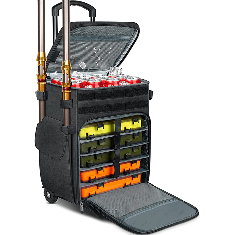 4. Two Ways to Use it: Rolling fishing backpack with two off-road wheels makes walking on uneven ground easier.The detachable design of the cart allows you to freely choose how to carry it when you go out fishing. Double rods trolley without buttons can be extended up to 37in.
