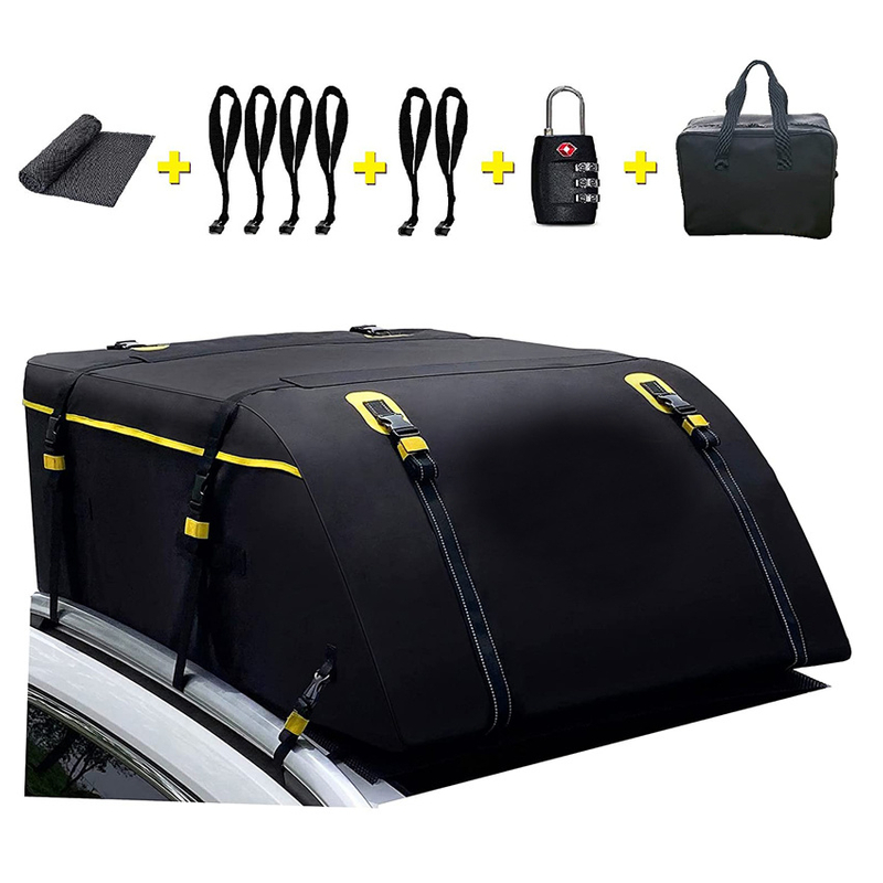 -The anti-slip mat prevents the rooftop bag from sliding off the car;The reflective straps increases the safety of driving at night;The storage bag with high quality, built-in door hooks storage design, so that accessories orderly storage, easy to carry.The 20 cubic feet roof bag can hold 4-6 suitcases,travel luggage case, tents, sleeping bags and more.