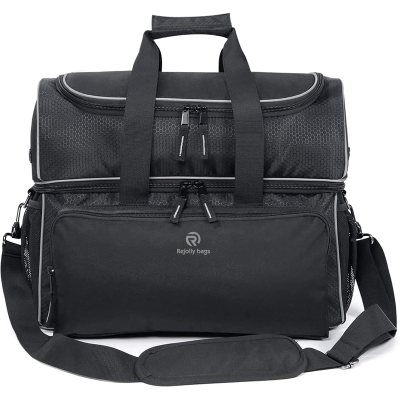 1. The Double Bowling Ball Bag is large enough to carry all your bowling accessories, consisting of a main compartment for 2 bowling balls, 1 front pocket, 1 back pocket, 2 side pockets and a dedicated shoes compartment(with ventilation vents) for a pair of shoes (up to men's size 16) and other gear. Those numerous pockets allow you to easily organize your items like ball cleaner, bottles, towels, socks, phone, wallet, keys, etc.