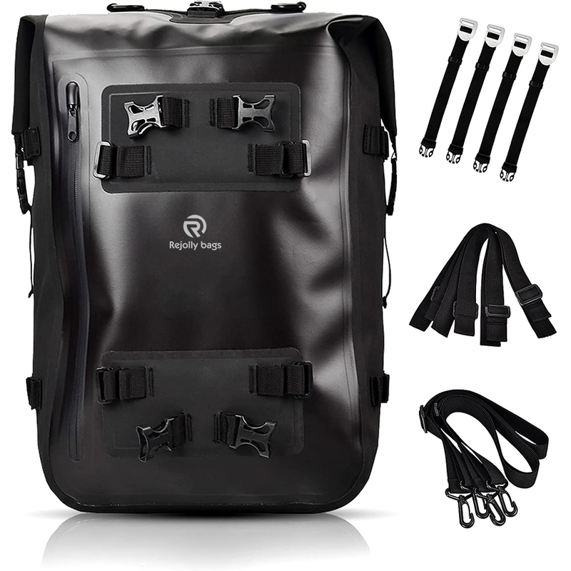 1. QUALITY MOTORCYCLE BAG: 10L Newest motorcycle tail saddle bag , size: 32cm(L) X 25cm(W) X 43cm(H), weight: 1.2KG. Made of high quality waterproof TPU and oxford material, the tail bag is with good IPX6 waterproof, no fear of rain during the your driving.
