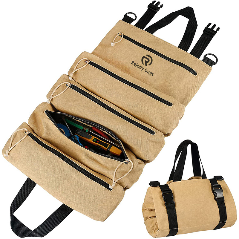 4. Handy Organizer: Each canvas tool bag comes with 2 grommets for vertical hanging on the wall or other places. The tool rolls is divided into 5 pockets of different sizes. You can use a marker to write what is inside of each pouch for easy identification