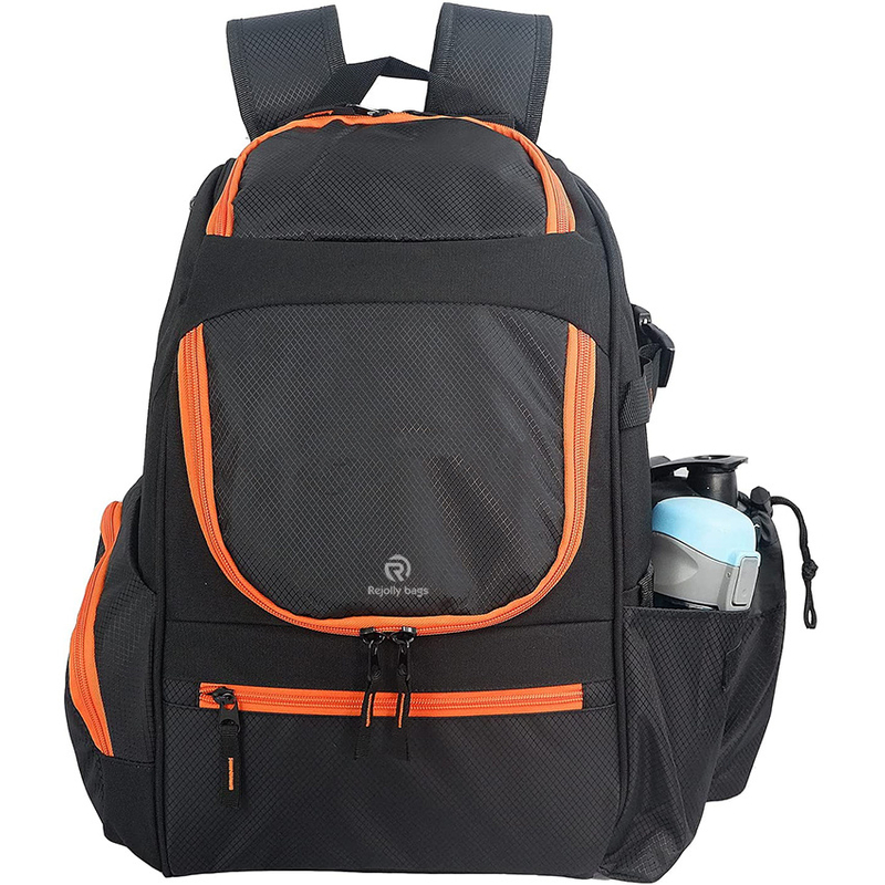 4.frisbee golf backpack is well designed and built hard to stand upright on the ground without tipping over since thick PE foam and PE board are inserted in some places. A divider with hard PE board inside can organize the discs and keep them upright in the main compartment